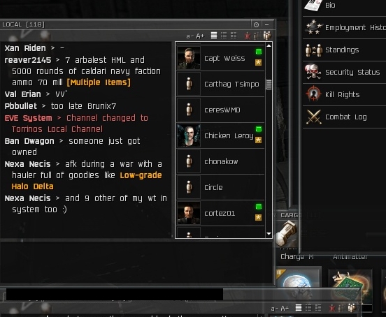 I love playing stupid with them. It just causes more confusion and annoys them even more most of the time. Still this alliance was all over the place and then once we started killing them they put out the word to meet in Torrinos because they were hiding with IRON alliance and camping the EC gate. Seems this is the "carebear camping gate" of Eve. Of course they claimed that us killing them had absolutely nothing to do with them relocating.