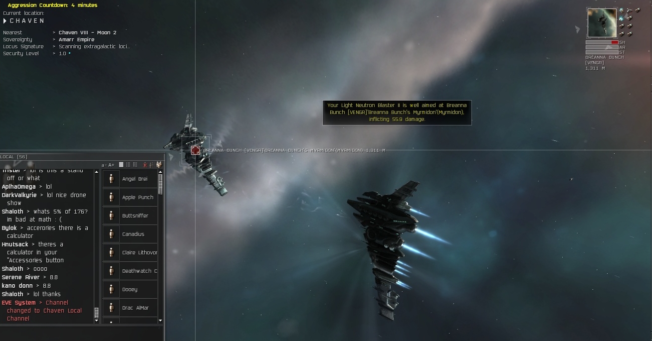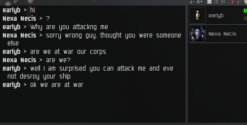 One of them was bragging in local how they had 3 wars going and no one wanted to fight. Which was quite amusing given the encounters I had with them, they all dock the second any of us go into the system. Or they logoffski when they're about to be caught. Keep in mind this is a guy from Vengeance Ascendant's sister corp, Vengeance Imperium. They decided to dec us one they were out of their alliance. Their other corp can't fight their own battles.