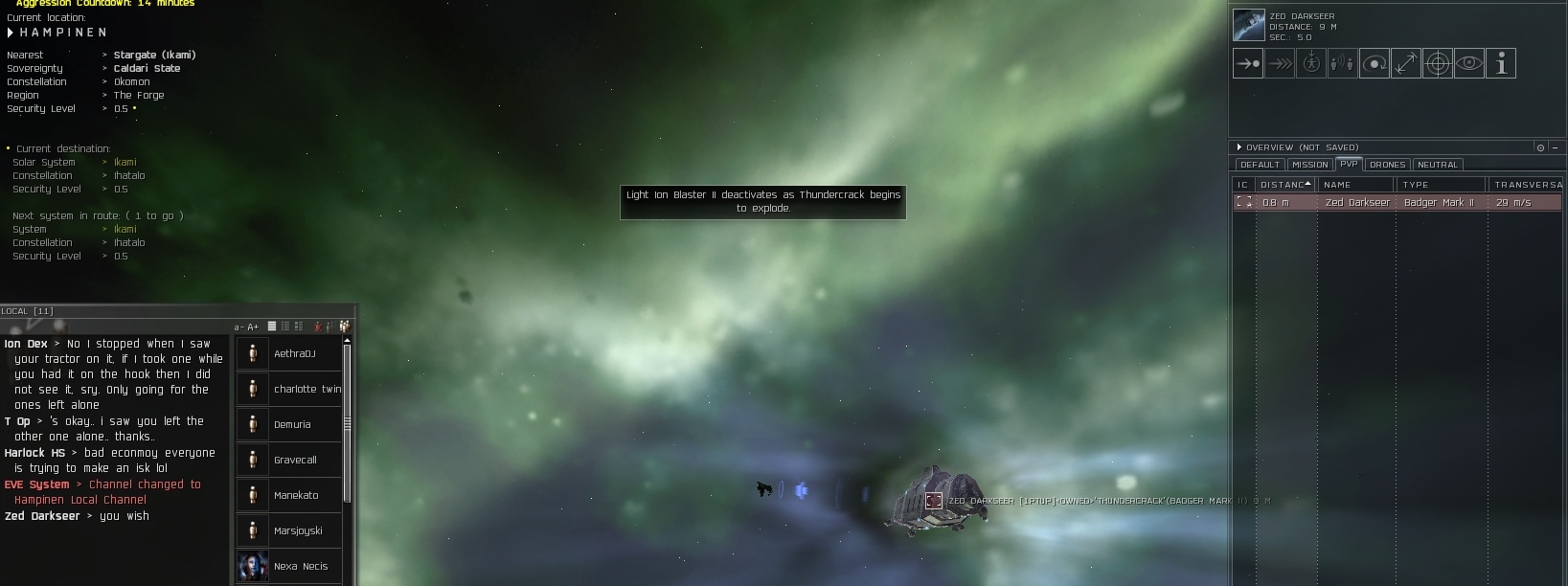 Instead of moseying over to me, they hug the dock radius which is very large in Chaven. They refused to leave it. So I sat there waiting and waiting and they would do nothing. Then one of them logs out. Unfortunately for them, there was still an aggro timer. Fortunately for me, I have a prober on hand at all times.