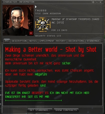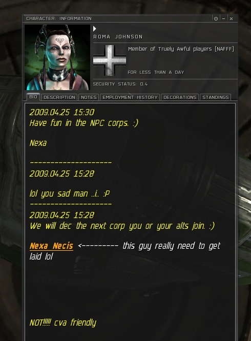Then there's players who delude themselves into thinking they are actually good at PvP. There was one guy in a mission, he saw us warp into it, he ran out, docked, and quit corp. Now check out his new corp, his bio and title.