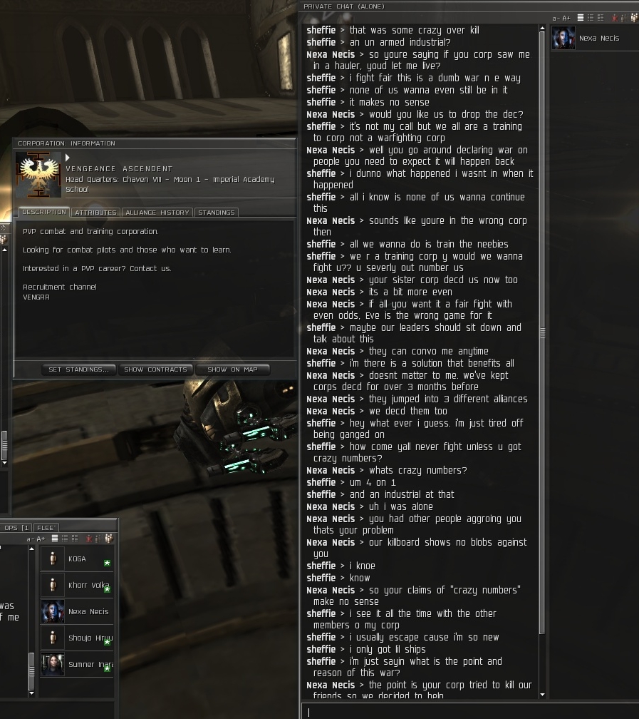 That's a truly shitty corp. They run around decing random people then get mad that they're getting owned so they cry for help to their friends. Vengeance Ascendant's CEO convo'd me to apparently negotiate a surrender. It was a ploy to "trick" me into admitting I plan on decing them permanently and decing any splinter corps they make.