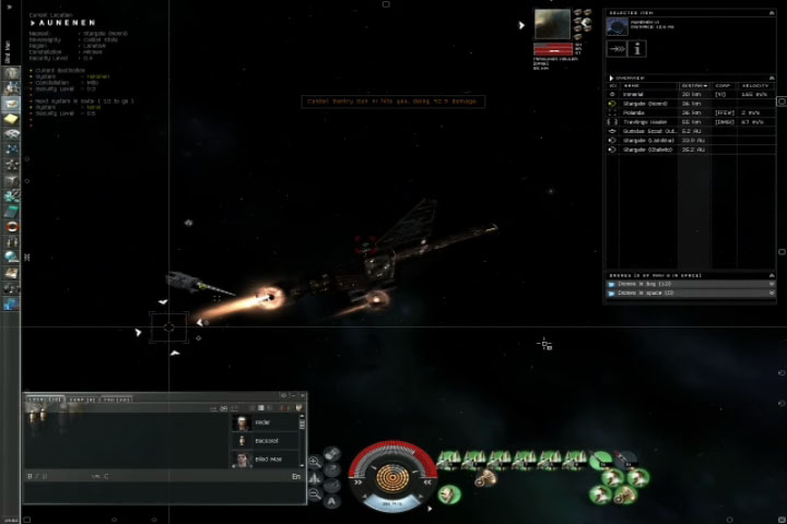 EDIT: Changed from bmp to jpg.. // AnderAfter school a good old buddy of mine that goes by the EVE name of Blind Man were walking home and I decided to go to his house. He logged on in a station in Aunenen and decided to check the gate for a tasty target or two. He found a t1 hauler and popped it. As he was going for the pod another Hauler icon appeared on his overview. *Right Click Look* GASP the words "Remove Freighter from overview" appeared on the menus. So with him and me both quite surprised he locked it. With the 1-2 second lock time on something as big as a freighter we quickly look to the icon at the top and found his health status to be in quite a poor condition. Specs are %45 Shields