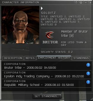 He of course then whines on that he's a newbie and I am a big bad bully for picking on him and his other friend and all that good stuff. I asked why would your corp threaten to war dec us if you weren't prepared to back it up. It seems the CEO didn't really keep his players informed of his actions so this guy and his friend suffered some losses. He tells me he is pissed at the corp and wants to leave them along with his friend as well. So I tell him how to go about it. He quits it.