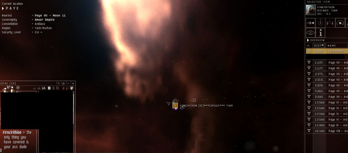 Five minutes later he's in Paye. Ok so we head out there. I get intel that he is mining with another corpmate in their barges. So as we are waiting to zone over and warp to them, one of their guys in a Thrasher warps to the gate. First blood has been drawn.
