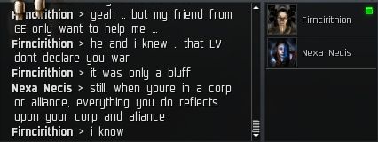 It looks like he is in Galactic Empire which is an LV allianced corp. Now this could get interesting but I highly doubt LV would war dec a small corp like mine, but you never know. I checked with someone in LV to make sure that threatining to war dec a corp just to defend a non-LV corp is allowed. I was told it was allowed but they won't be dec'ing us unless GE really wants to.