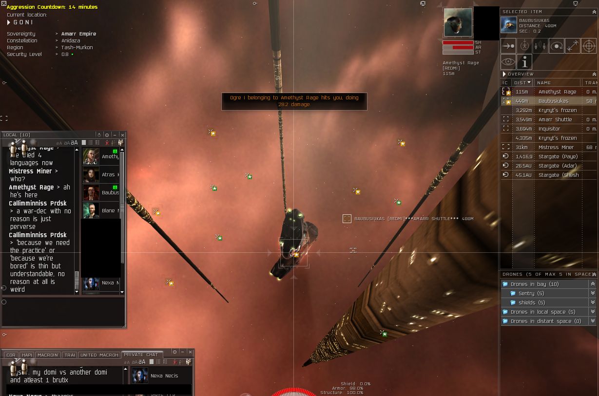 Things are looking good. I am surprised the Brutix pilot hasn't undocked to join the fray. A few seconds pass and he undocks........in a shuttle!