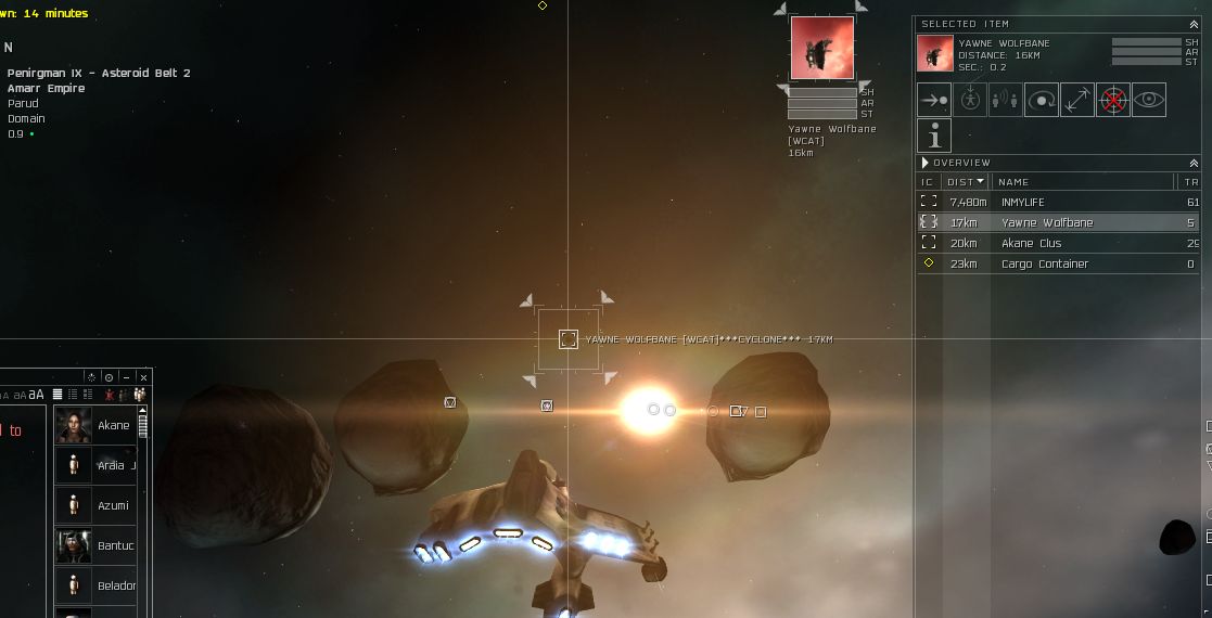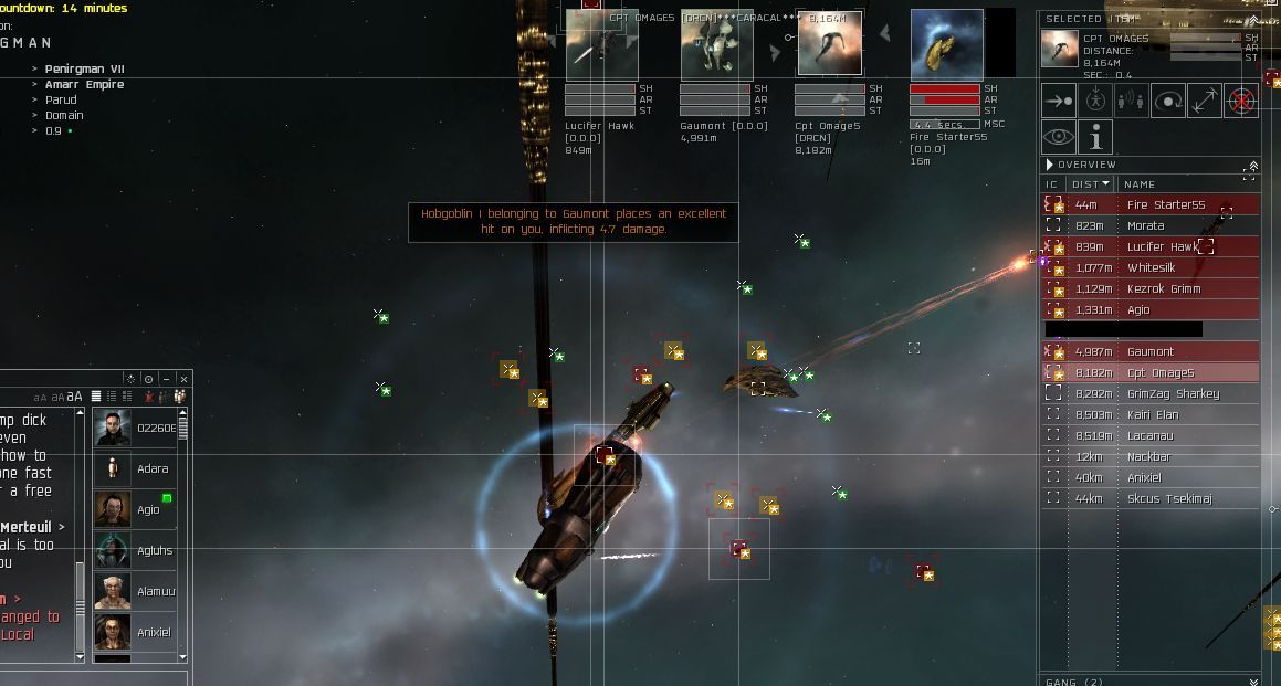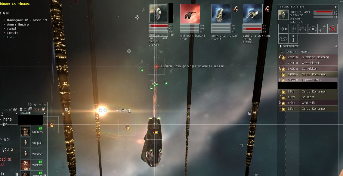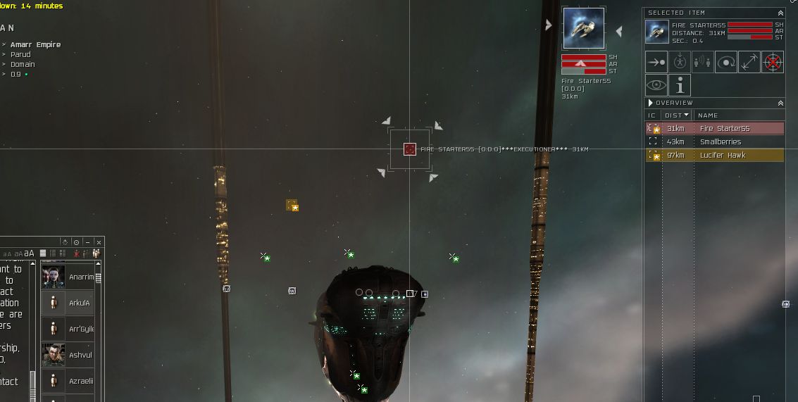 Now at this point I've stirred up a hornet's nest. Several Peregrin guys start entering the system and several Draconian guys also are there. They all undock and orbit me. Mind you, the wars with them haven't even started yet and my timer was out so it's not like they could do anything to me. Notice the local chat with Firestarter55 asking what's going on? Keep an eye on him for later. :)