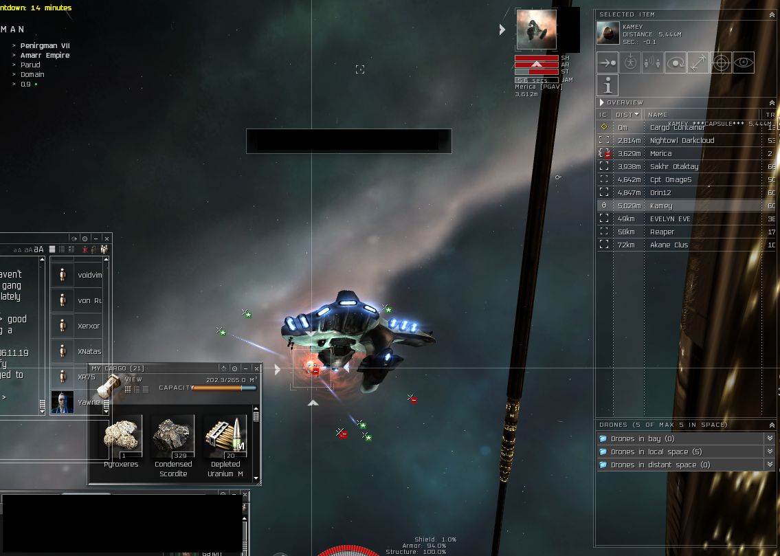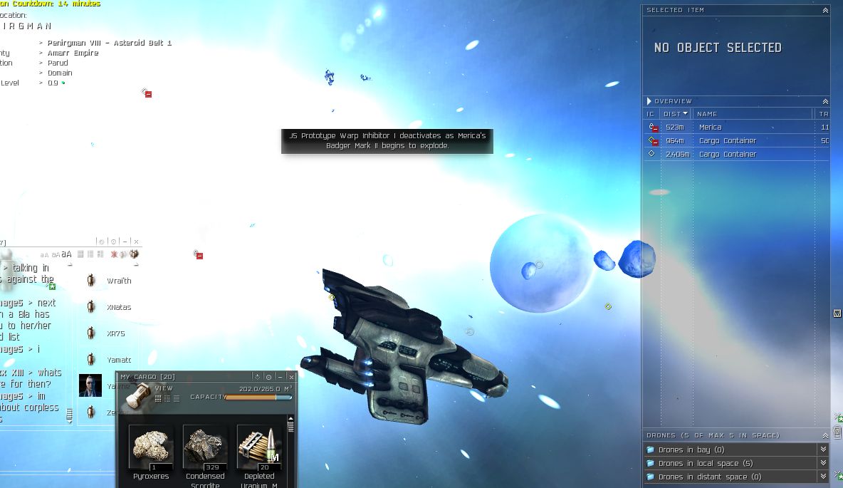 A few belts later I stumble upon a mining op by Peregrin players. There's a few cans but no players around. So I swap the ore to my can and wait. 10 mins goes by and nothing. So I head to the station housing their HQ. None of them are there.