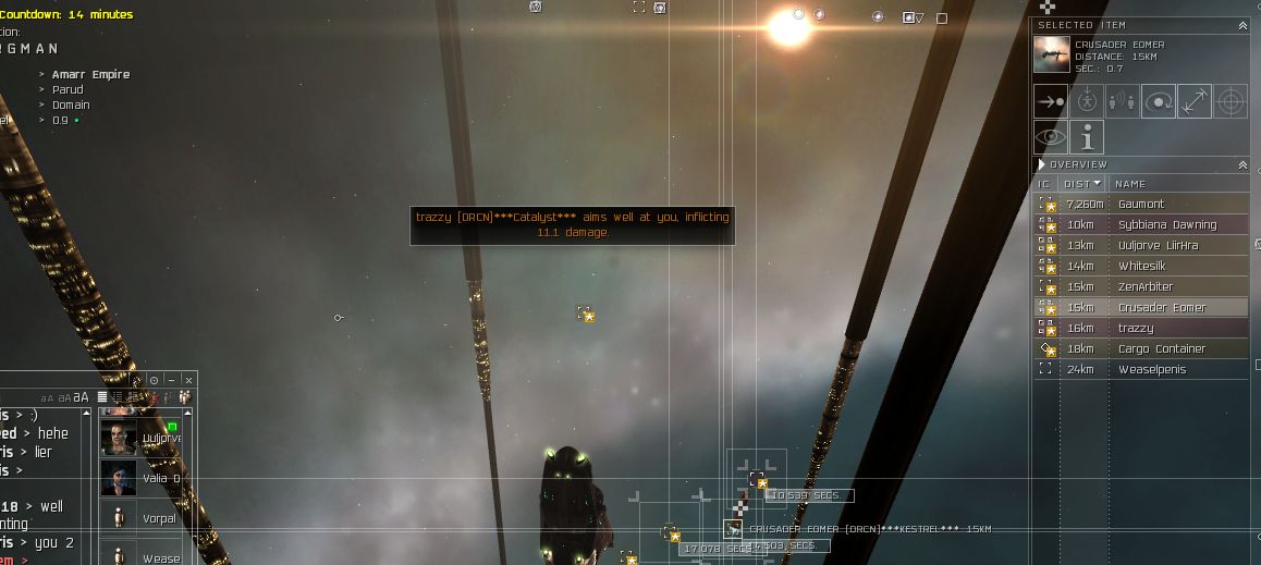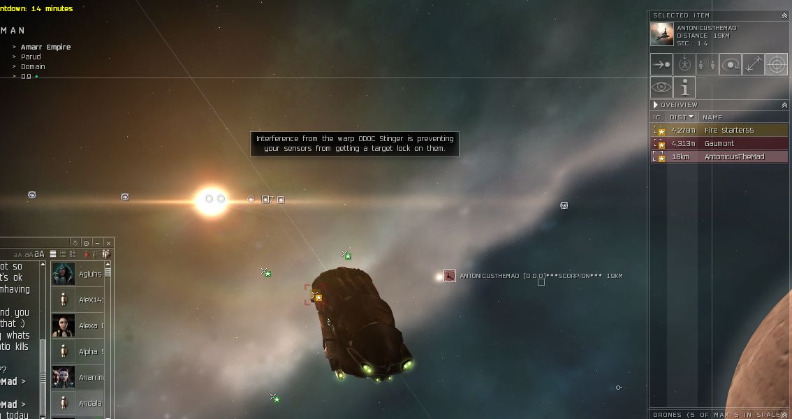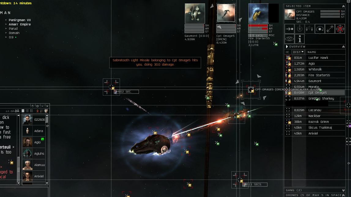 After about 20 minutes of Peregrin's posturing, one of Peregrin's senior officers convos me. He is quite rational, respectful and quite aware, "it's only a game". So he is a pleasure to speak to compared to some of the raving lunatics I usually get.