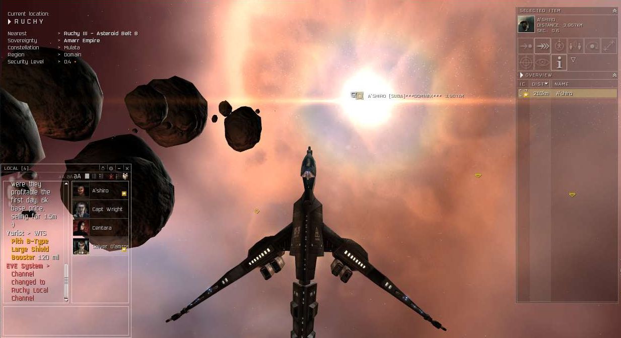 Still I found it funny that the Subach guys in the system were calling my 2 week old corpie in a Merlin a wuss for not undocking and engaging a Tristan, Hawk and Drake yet at the same time a few systems away I was camping one of their members who refused to undock. Though of course, I never said a word to them. I waited silently. Nor did I say a word to their CEO when he ran from my Domi in his Curse.