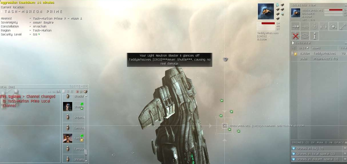 I guess they didn't realize the distance from the SG to the station was quit long, about 55au, so by the time his friend in the Sac got there, he was as good as dead. Notice I typed "jump in" in local, I meant to do it in corp chat though. I r a n00b.