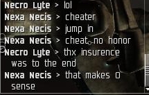 [ 2007.06.03 17:03:58 ] Nexa Necis > well if you're offering a 1 vs 1 id have to decline since your corp has offered a 1 vs 1 before and cheated