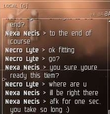 Later in the day I log back in and Necro Lyte offers me a 1 vs 1. He asks if he needs to fit a scramber or will I willingly fight to the death. I tell him it's to the death and he can refit all he wants. Mind you he undocked to scan my setup first before he would engage.