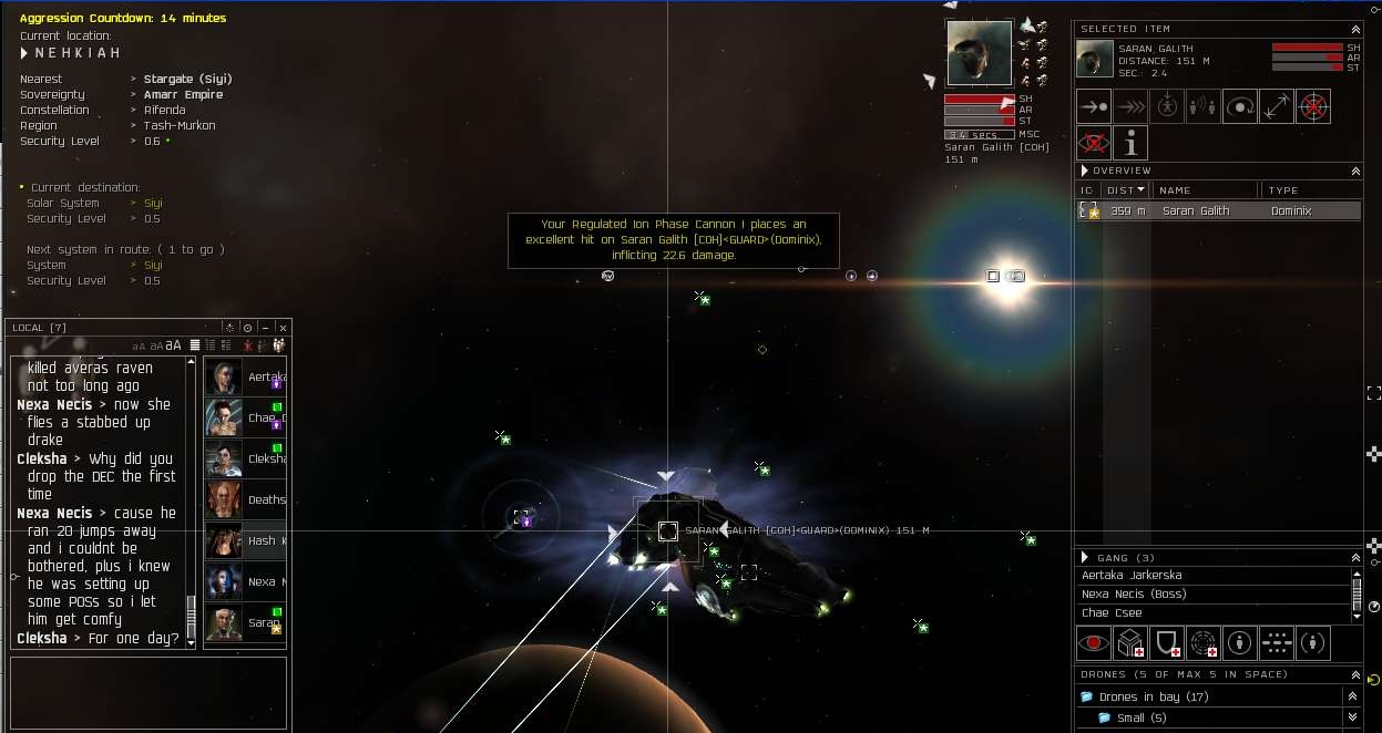 We did manage to snag a Drake pilot though. Those friggin things are still way overpowered. My Domi with it's blasters and heavy drones couldn't break the tank on it, even when a few Inty's showed up to help me he was easily maintaining his shields. He eventually went to run as he probably expected more backup to be arriving. He deagressed and jumped through the gate, only to find said backup already waiting for him.