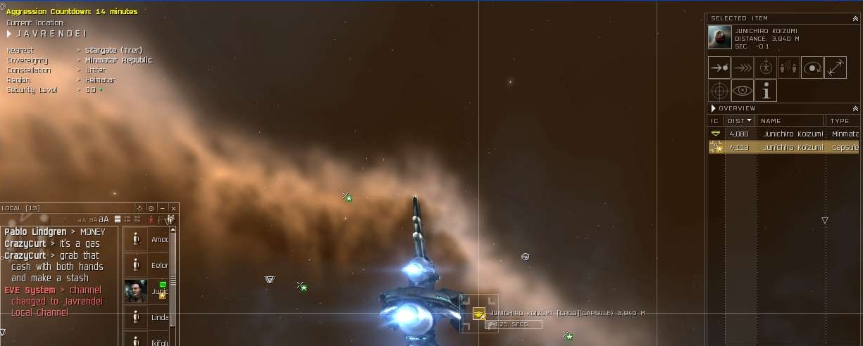 At this point, they are non-existent really. No more roving gangs as I said, just people missioning and mining. The funny thing is some of them decide to mission only a few jumps away from Tash where we are located.....