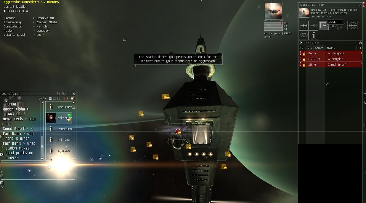 One night in Umokka I was trying to fight one of them. Of course they wouldn't do anything. Undock, redock over and over. He calls out a warning, but he messes up and puts it in local.