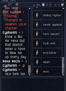 You know how I love posting those crazy chat logs provided by our enemies, right? Unfortunately they failed to provide us with any such smack. Their alt was a bit mouthy when we dec'd him but the alliance as a whole seemed quite stable and quite civil at all times. Fortunately they did provide us with plenty of pvp, to the point we kept them dec'd for about 8 weeks.