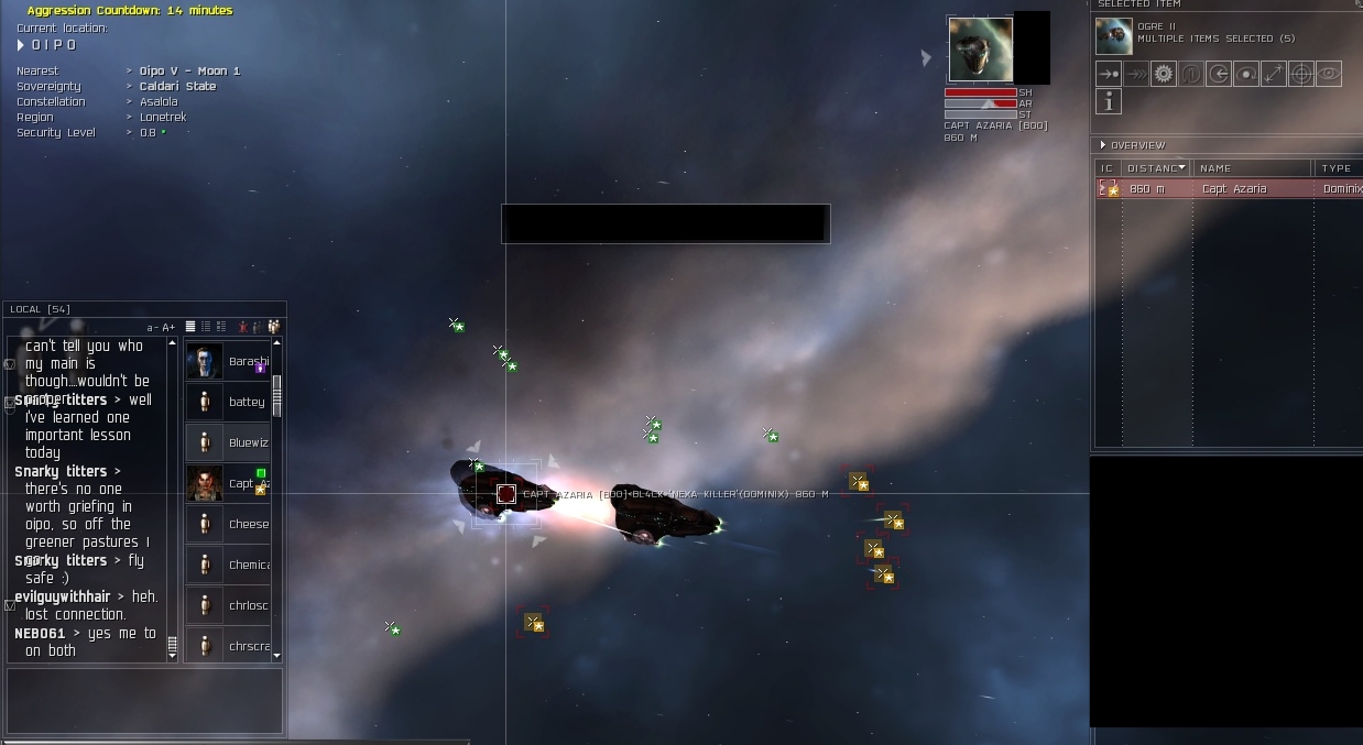 TBH the main reason you snagged me was because for some reason only 1 of you showed up on my overview. Well 2 actually, the Osprey or Moa I popped and the Hype.