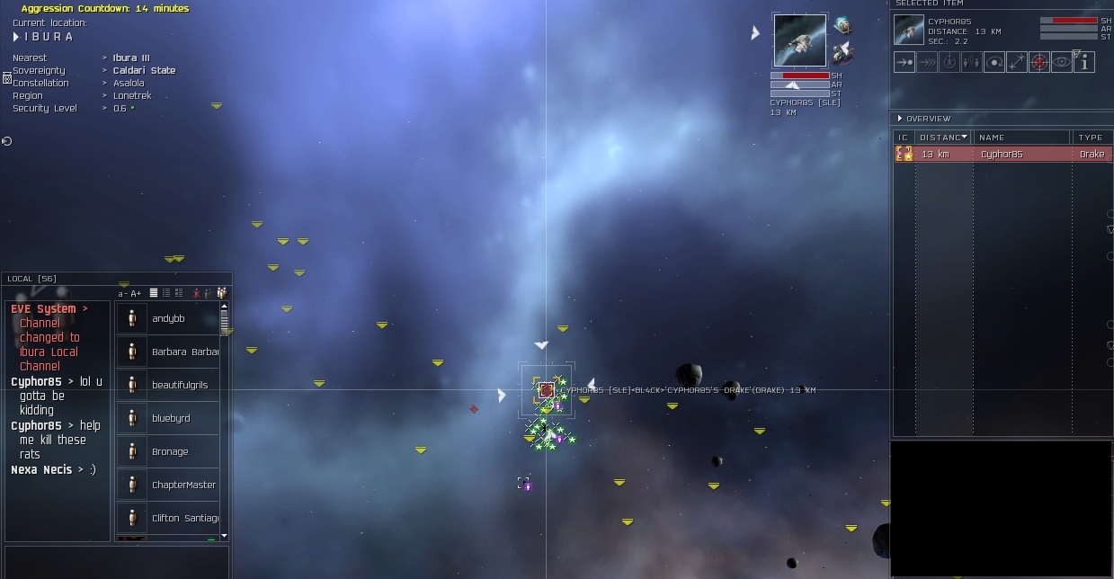I felt bad for one of their guys Cyphor85. He ended up losing 7 Drakes, a frig, a dessy and 4 pods. I remember one night I popped him...