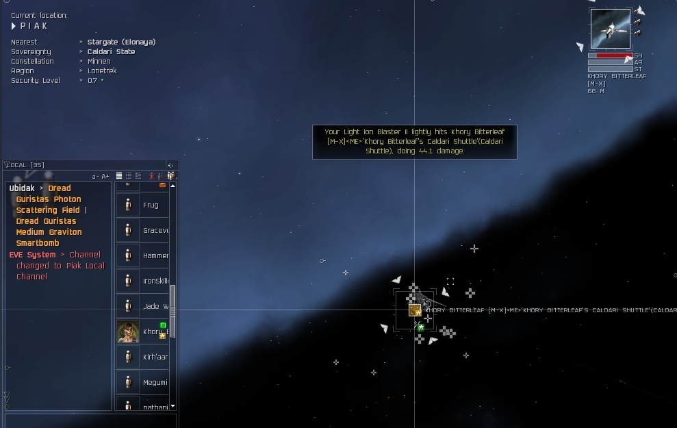 I even managed to pod him. I scored over 80mil in loot off him which was nice. Then, 30 minutes later he passes through the system with me. I had since switch to a Taranis. He was in a shuttle. He warped to 0 at my gate and I popped and podded him again!