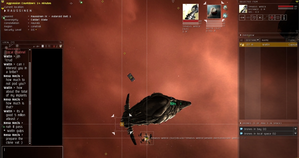 There was one funny time where a few of them and a few of us mixed it up a bit and they came out on top. But somehow they made a newb mistake after the fight. One of them decided to loot one of the wrecks which was 50k off the station.