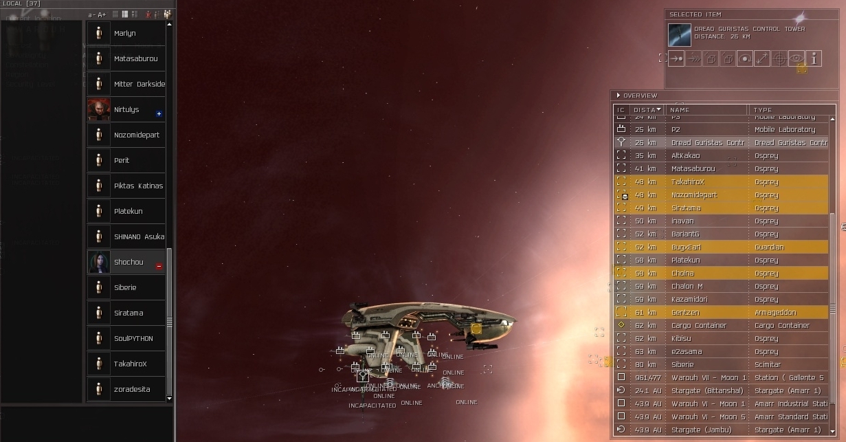 So the Izanagi guys saw the bunch of us in system and decided to help out the pharmer corp. They brought a shitload of people, up to 30-40 at a time to rep the shields. The problem was we couldn't make a dent in them, they would just rep each other, then swap to a combat ship once they had aggro. Believe me, you can't pop an Osprey with 3 people hammering it when he's repped by 15 other Ospreys and 5 Logistics ships, nevermind trying to kill a Command Ship with that same support.