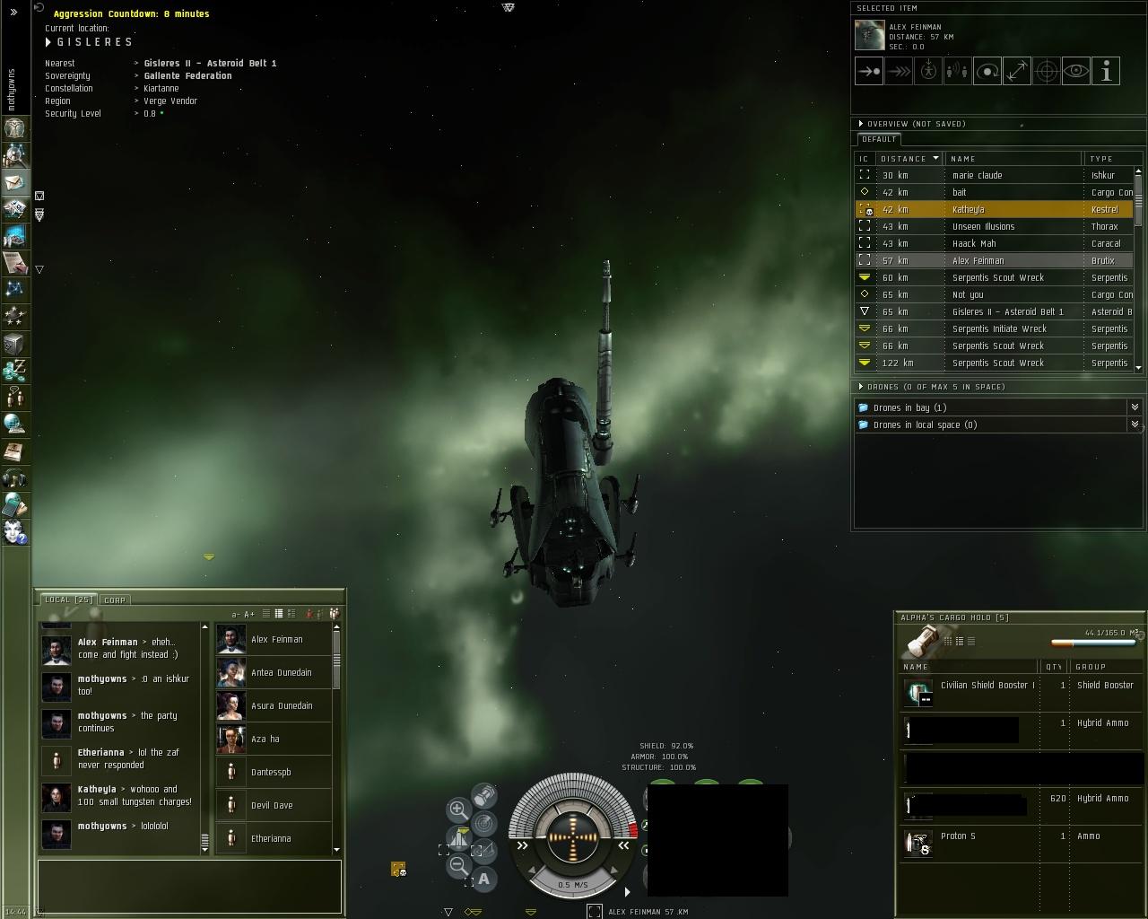 I head over to a nearby ice field I found out about very recently, as it's usually literally teeming with ice miners (which give serious lag when you warp in). A nearby can looks inviting, and I flip the contents. The miner warps off and comes back in a brutix, but I'm feeling a bit daring and a bit bored, which is never a good combo. I take it on in my trusty lil' frigate. Amazingly enough, I couldn't do anything and I got to 25km and warped off. A quick couple of jumps later and I'm back in my domi for more action, and thankfully the brutix is still lurking about. I engage, and he only eats around half my shields before popping. Not surprising when you see his elite setup. It was the most random thing I have ever seen and I can only guess it is all looted from rats:
